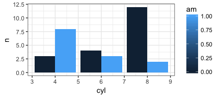 ggplot(aes(fill=am, y=n, x=cyl)) +